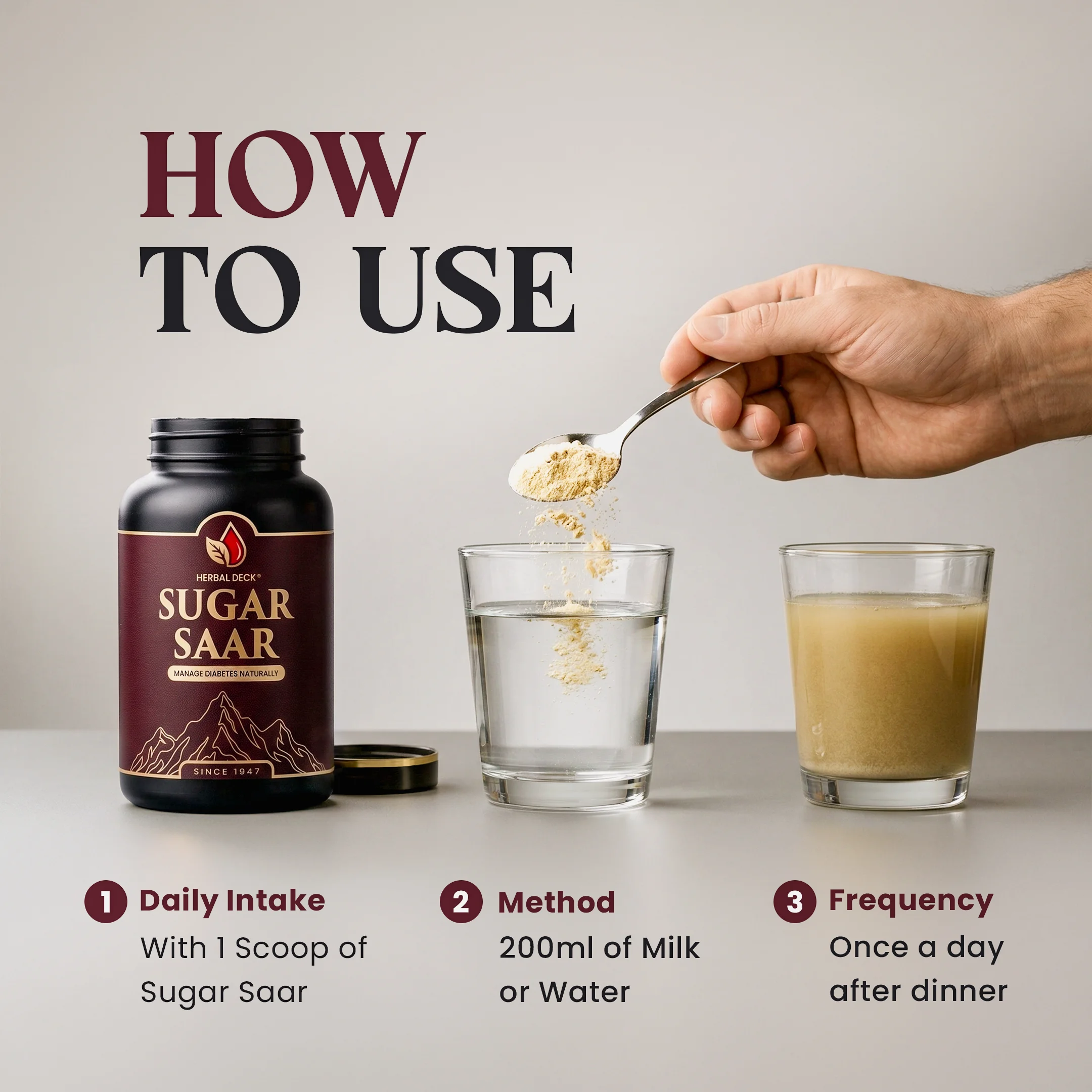 Sugar Saar एक आयुर्वेदिक हर्बल फॉर्मूला है जो शरीर में ब्लड शुगर संतुलन बनाए रखने और मेटाबॉलिज्म को सपोर्ट करने के लिए बनाया गया है।